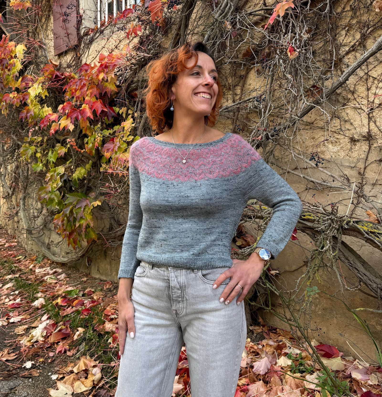 Mais quel est ce modèle? Il s'agit du pull Pink Velvet d'Andrea Mowry, tricoté en Tweed Bleu Gris. Le contrastant est un échantillon de suri alpaga coloris Bruyère que j'avais mais qui n'est pas au catalogue. A la place vous pouvez utiliser un écheveau de Délicatesse.